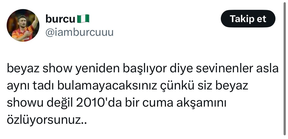 Geçen sene X’te Beyaz Show’un tekrar yayınlanacağı haberleri yayılırken bir kullanıcı şunu demişti; “Sen Beyaz Show’u değil 2010’da bir Cuma akşamını özlüyorsun…” O günden beri yaşadığımız daha doğrusu nefes alabildiğimiz alan o kadar daraldı ki; nostaljiye tutunmak elimizden gelen tek şey oldu.