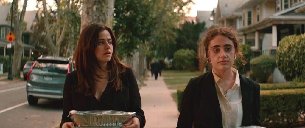 Belki de bu kişisel bakışın da yardımıyla Shiva Baby, bir an bile ana karakterini yargılamıyor. Aksine çevresini ve onu düşürdükleri durumu en çiğ haliyle gözler önüne seriyor ve bu medeni olduğu iddia edilen toplumun bir karikatürünü çiziyor. Kimse Danny’nin şimdiki anda kalmasına izin vermiyor mesela. İlk andan itibaren sürekli bir sonraki adımını düşünmek ve geleceğini planlamak zorundaymış gibi hissettiriliyor. Bu da yetmezmiş gibi her yaptığı için hesap soruluyor ve seçimleri çok da ciddiye alınmıyor. Bir an bile kendisi olmasına izin verilmeyen bu genç kızın nasıl kendi ayakları üstünde durması bekleniyor ki? Annesinin ısrarla balık yedirmeye çalıştığı Danny, ona vejetaryen olduğunu hatırlattığında dalga geçiliyor. Biseksüel olmadığı, yalnızca biraz çılgın denemeler yaptığı yüzüne vuruluyor. Kendini bir türlü ciddiye alamaması belki de çevresinin ona böyle davranmasından kaynaklanıyor. Para karşılığı seks yapması da bu inanmadığı sistemin bir parçası olmak yerine kendine bulduğu bir gelir kaynağı gibi görülebilir. Maya, ona bunu neden yaptığını sorduğunda yalnızca kolay para olduğu cevabını veriyor. Bu cevabı sugar daddy’si Max’e bile dürüstçe vermediğini hatırlıyoruz: Max’i para karşılığı seks yapma durumuna ikna edebilmek için bile hukuk okumak istediğini söylemek zorunda kalmış Danny.